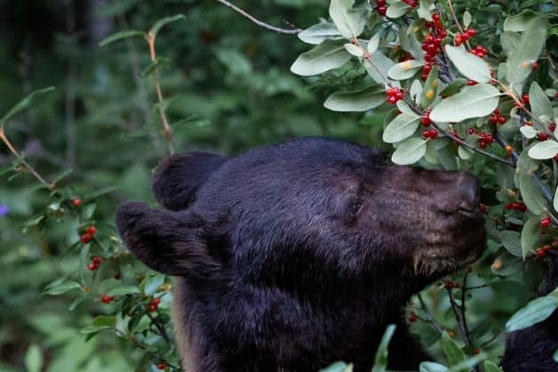 A bear’s focus is typically on finding and eating food. They need up to 20,000 calories per day (8-10 times what a person needs). A bear’s diet is 85 percent plants, with the rest being insects and mammals. They are most happy chowing down on berries and roots.