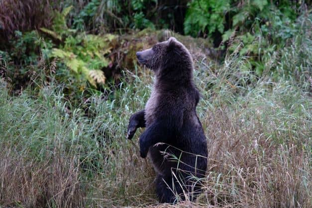 If the bear feels threatened or is protecting cubs or a food source, they may stand up on hind legs, huff and puff, or bluff charge. As long as the bear is 5m or further away, just keep talking and backing up slowly. If you see cubs, avoid getting between them and their mom. If the bear comes within 5m and doesn’t seem to be stopping, spray a few puffs of bear spray at their nose. Keep backing away from the bear. More than 95 percent of people who used bear spray in a close encounter are not hurt.