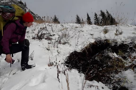 Be on the lookout for signs of bear activity like digging in the dirt or bear poop. Also be aware when you are passing common bear food like ripe berry patches or cow parsnip. When you see these signs of potential bears, keep close together and call out louder and more often.