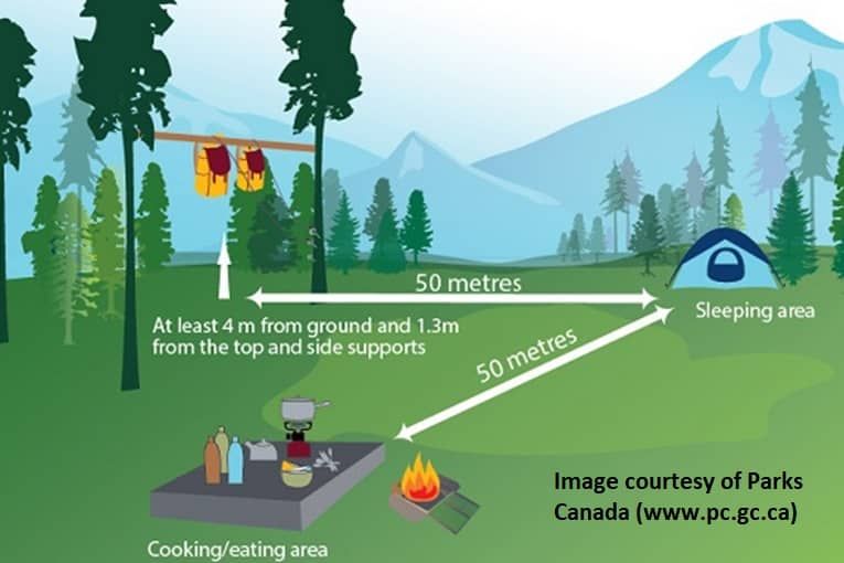 Store all food or other smellies (toiletries, bug spray, garbage, soap, food scraps, etc) in a bear-proof storage or in a bear hang.