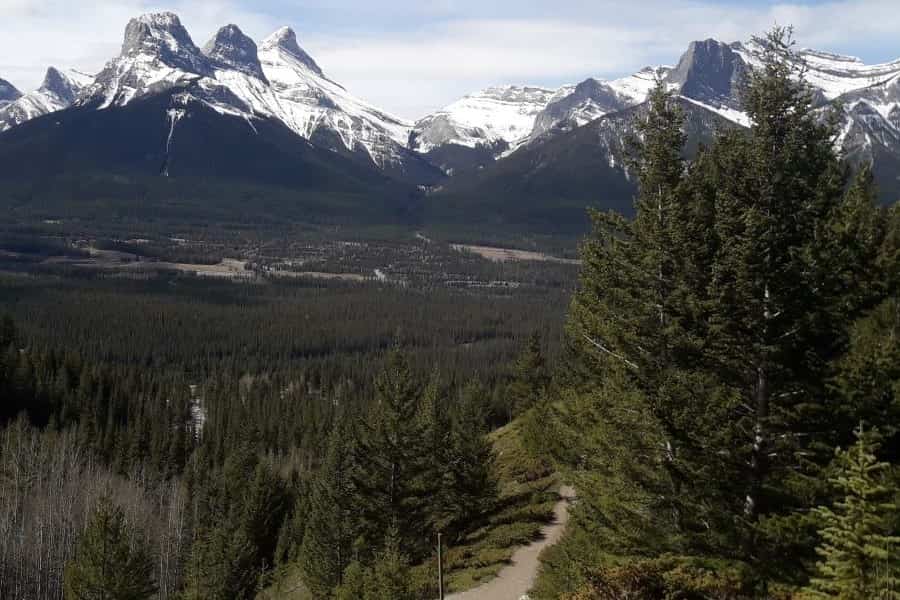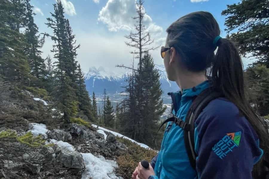 At the furthest east point of the loop, we broke out of the forest and were treated to some awesome views of the three sisters across the bow valley. This was the perfect place for an early lunch where we could really soak in the Mountain views. From here we had two options: loop back towards our starting point, or explore the trail above us (the Grotto Mountain Trail). We had a fair bit of energy and so elected to head upwards. We knew we weren’t going to go all the way up the Grotto trail (as that would have been well over 1000m more elevation gain) but we were curious what the trail was like and what the views might be. It was also good to check out in case we wanted to come back to Hike all the way up Grotto one day. We hiked up the Grotto trail for another 30 mins or, took in the views, and then headed back down to the Horseshoe loops.