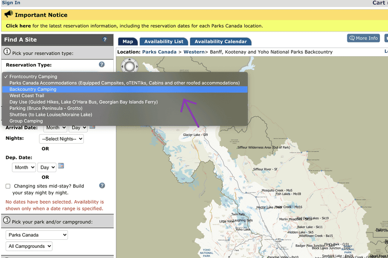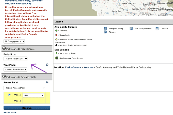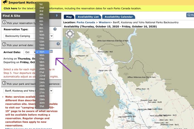 Follow the steps; select backcountry camping, the date you plan to spend the night, and fill in the remaining prompts. The site provides you with an interactive map showing you the location of the campsites. It even provides rough hiking distances.