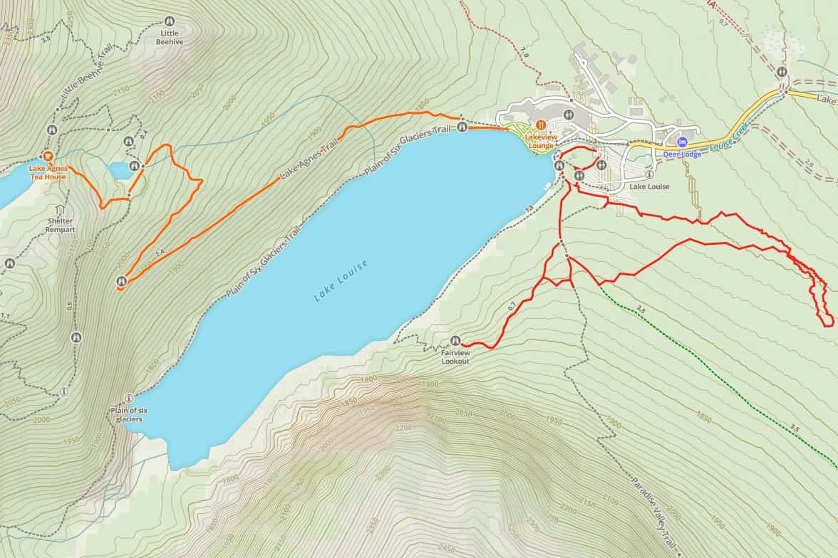 From Lake Agnes, there are several options for additional adventures depending on energy and the weather. Shorter objectives include the Lake Agnes lookout, little beehive, or big beehive, all less than 2km out. For ambitious hikers and tea drinkers, there is a 6km trail that leads to the Plain of 6 Glaciers tea house, but note that it will be another 7km from that teahouse back to the Lake Louise parking lot so only attempt this if you’ve got lots of daylight and energy.